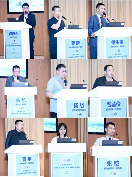 云南省第一人民医院熊达主任的讲题《心脏手术微创化实践体会—昆华经验》,为心脏手术的微创化发展提供宝贵借鉴。中国医学科学院阜外医院董硕主任《小儿主动脉瓣狭窄手术策略选择与思考》的题目,体现了为此类儿童达到最优全生命周期效果的不懈努力。昆明市儿童医院洪伟主任的授课内容强调了急诊手术是挽救危重先心病患儿生命的关键,分享在危重先心病急诊手术中的治疗思路、手术时机把握、团队协作等方面的体会。大理市第一人民医院储生雷主任为大家介绍了主动脉脱套的准确诊断和及时有效治疗,提高临床医师对这一疾病的认识与处理能力。云南大学附属医院杨旭主任从心血管外科角度对心源性卒中进行思考,探讨心源性卒中的发病机制、心血管外科手术与心源性卒中的关系,以及如何在心血管外科诊疗过程中预防和处理心源性卒中,为跨学科治疗心源性卒中提供新的视角和思路。红河州第一人民医院钱孟佼主任分享了关于瓣膜性房颤改良迷宫术后心律变化与心房直径关系的初步研究成果,通过分析两者之间的关联,为进一步优化瓣膜性房颤的治疗方案、评估手术效果以及预测患者预后提供新的理论依据和研究方向。云南省第一人民医院曹宇主任分享了重症冠心病合并其他系统疾病的综合诊疗策略,包括多学科协作模式、病情评估方法、治疗方案选择以及并发症的处理等,为临床医生提供全面、系统的诊疗思路,提高对重症冠心病合并其他系统疾病患者的救治能力。云南省第三人民医院张铠主任分享了经皮肺动脉血栓抽取及支架取栓的诊疗经验,包括手术适应证、操作技巧、术后并发症的预防与处理等内容。